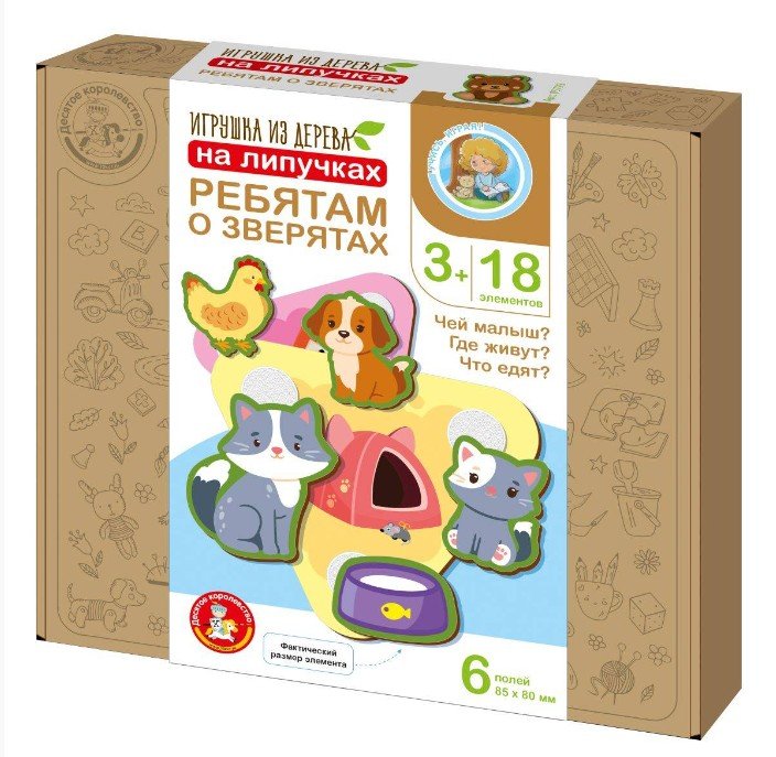 Все элементы животных и лакомства крепятся к игровым полям с помощью липучек «велькро». Ребенок должен найти, какие объекты прикрепить к определенной карточке, и точно соединить липучки, чтобы фигурка крепко держалась на картинке.