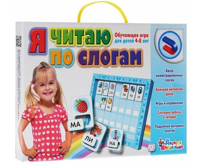 Подробная комплектацияМагнитная доска, касса иллюстрированных слогов с вынимаемыми вкладышами - 72 шт, кубик, инструкция