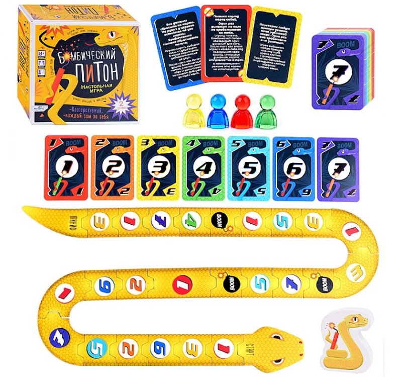 Настольная игра для детей и взрослых "Бомбический питон" - увлекательный игровой опыт для компании и всей семьи, в котором участникам предстоит испытать свою скорость и хитрость в борьбе с непредсказуемым соперником - Бомбическим Питоном!