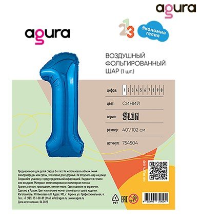 Шар фольгированный "Цифра 1" 40/100см Синий 1207-5022
